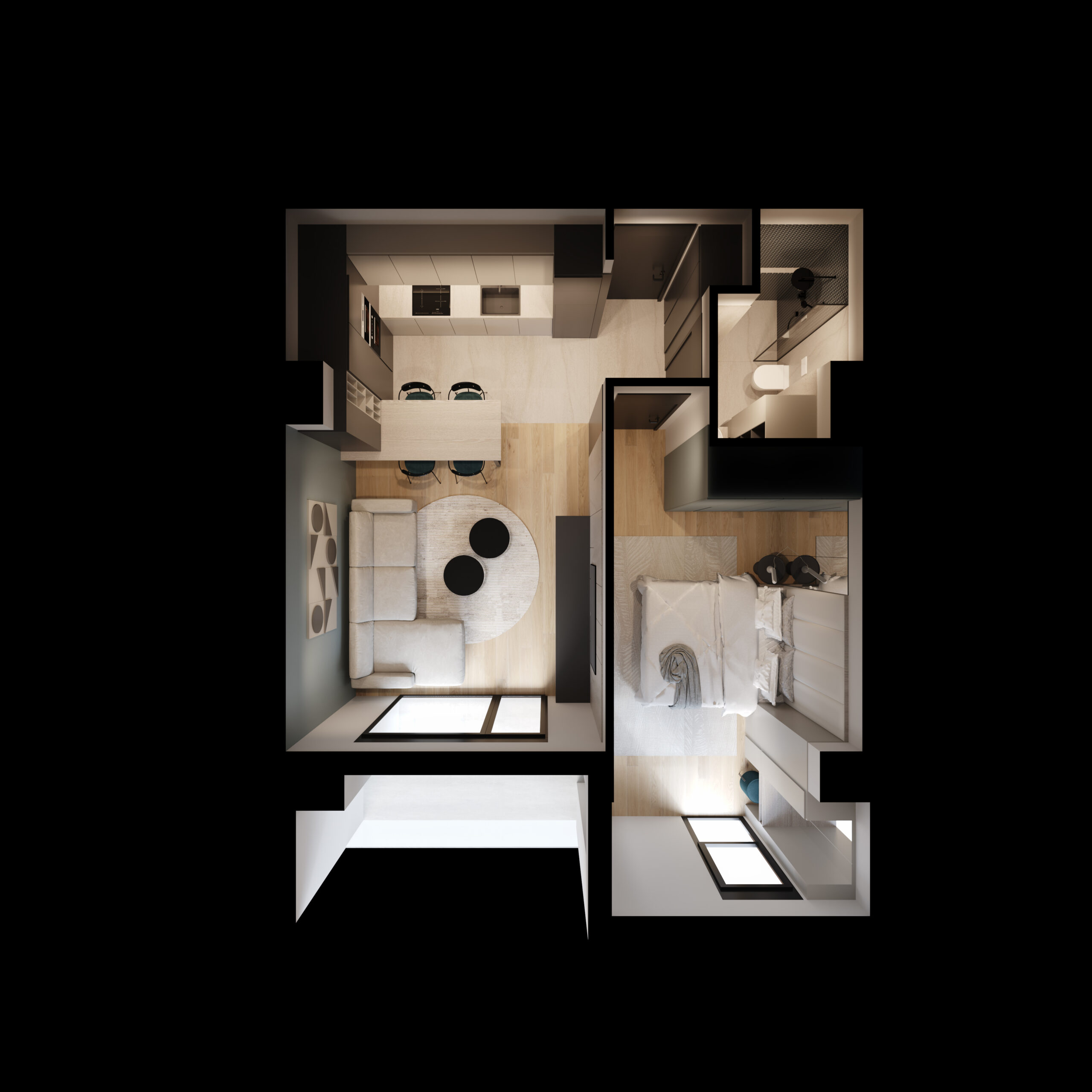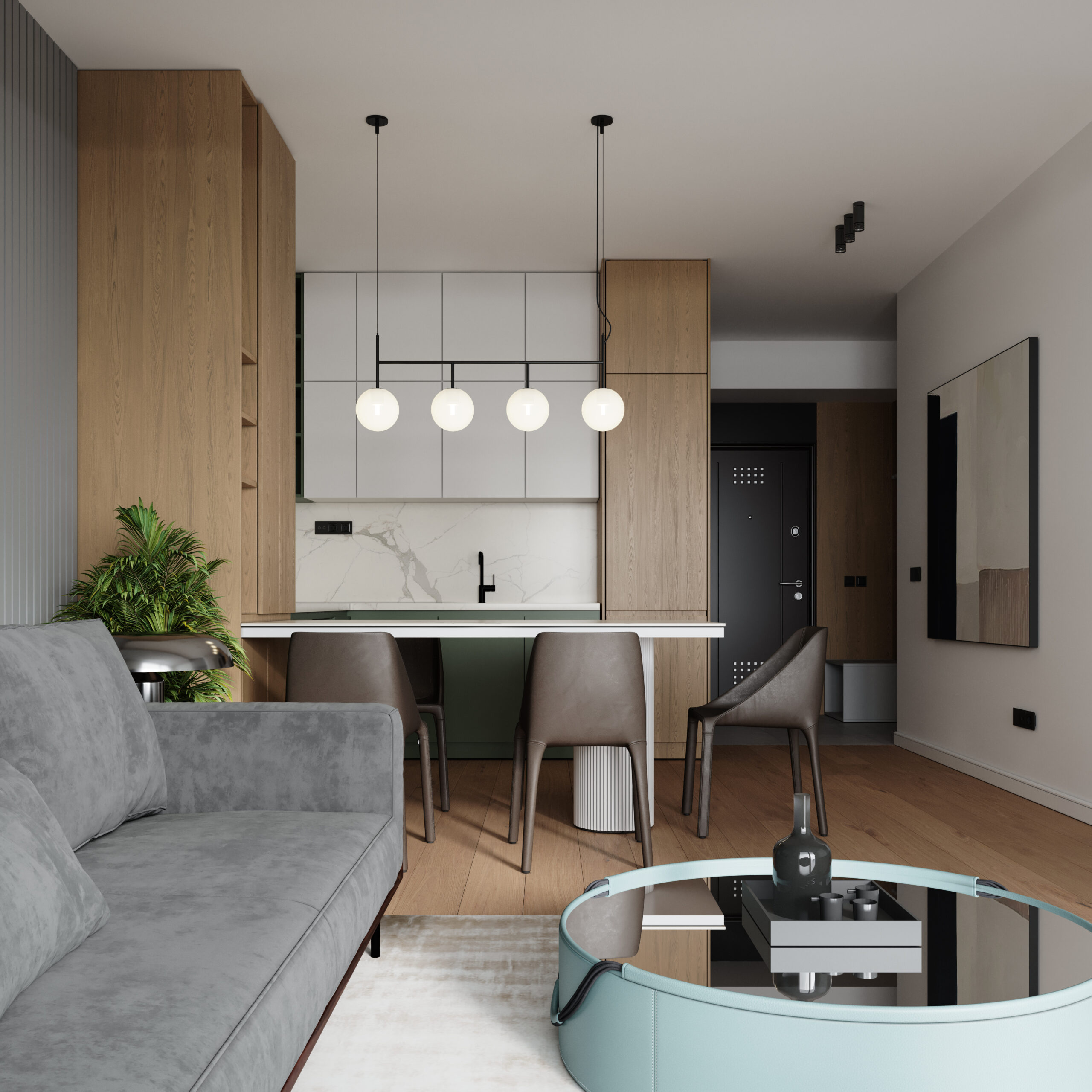 Ky apartament me një dhomë gjumi i projektuar me zgjuarsi është një zgjedhje ideale për një jetesë moderne. Me një planimetri funksionale, dritë natyrale dhe nuanca të ngrohta druri, apartamenti ofron një atmosferë të këndshme dhe shfrytëzim maksimal të hapësirës.