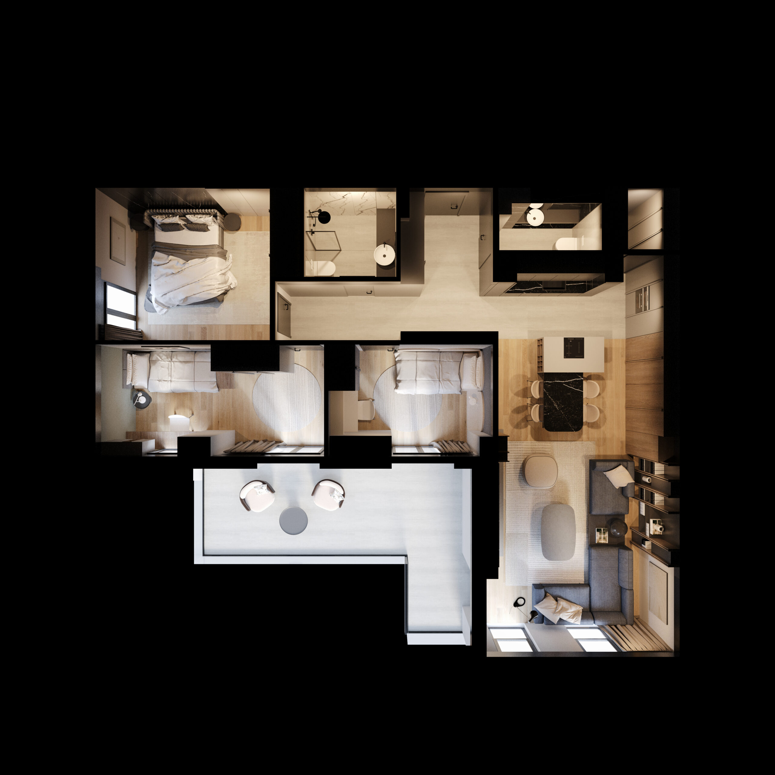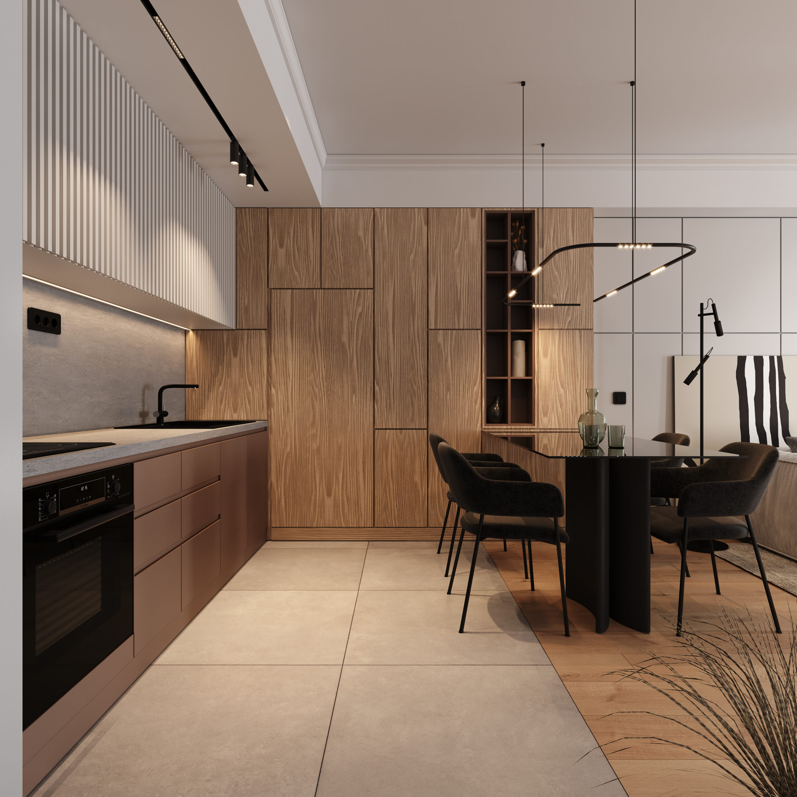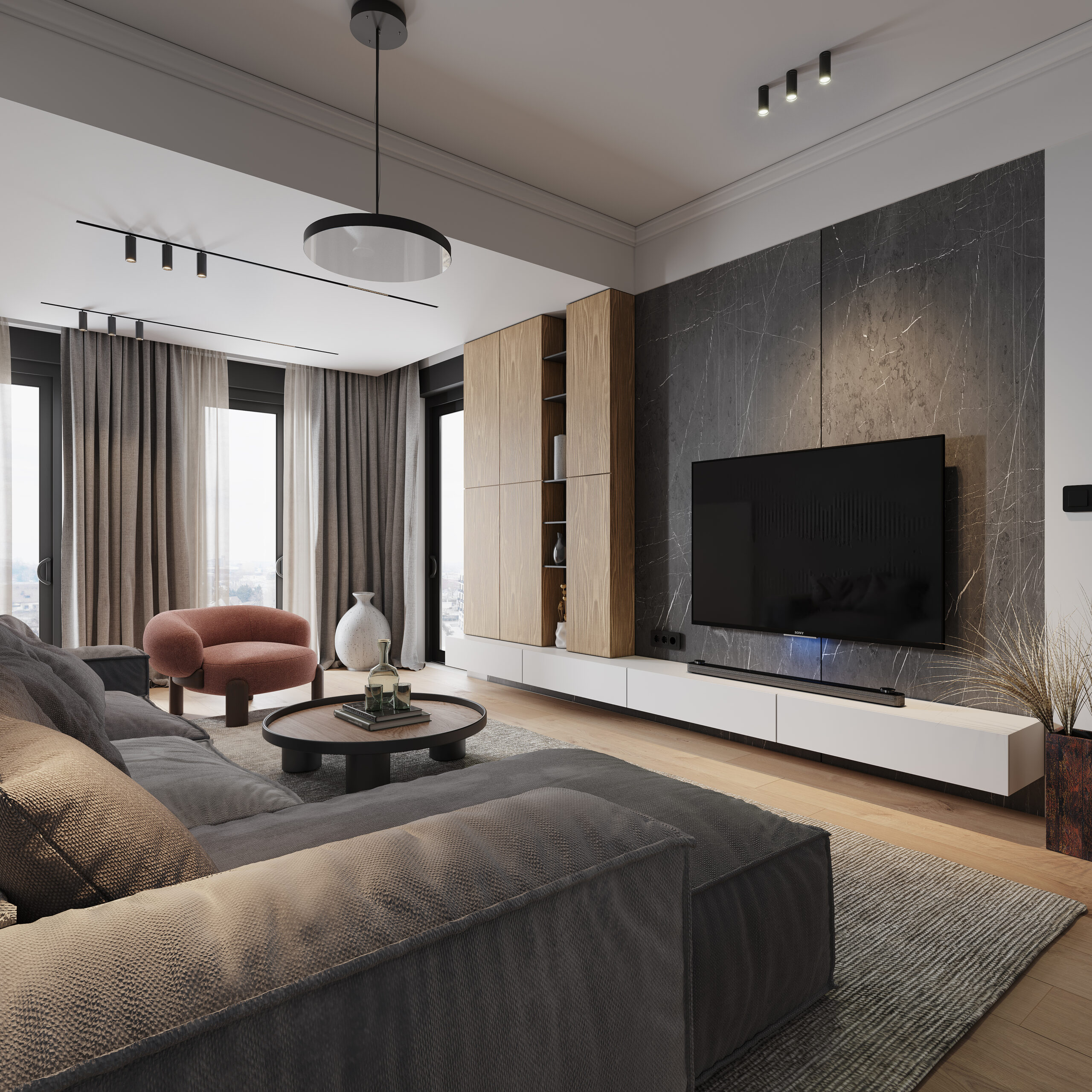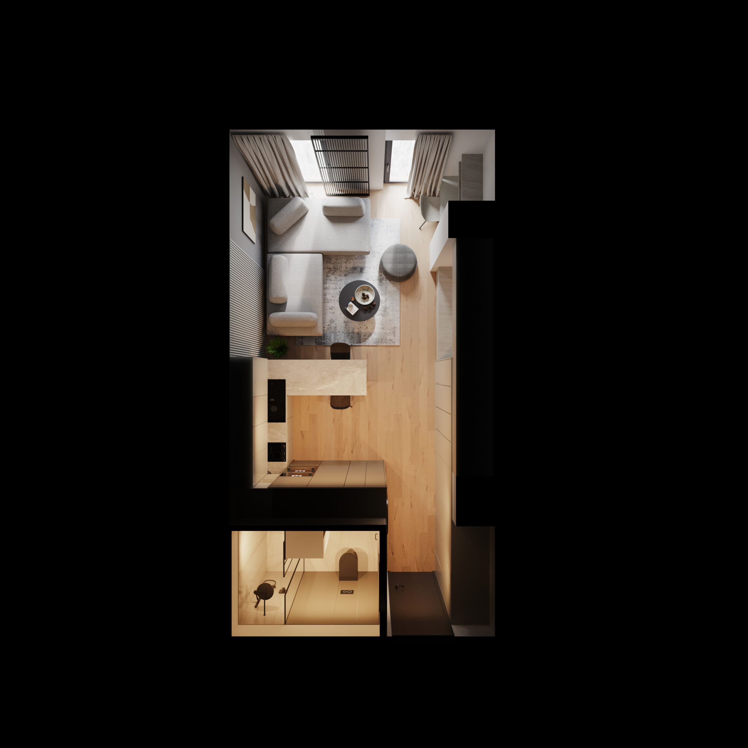 Apartamenti është projektuar për një stil jetese dinamik me fokus në rehati dhe privatësi. Me tone të ngrohta druri, përfundime të sofistikuara dhe shfrytëzim maksimal të çdo metri katror, ​​kjo shtëpi ju ofron një jetë të përditshme elegante dhe të qetë.