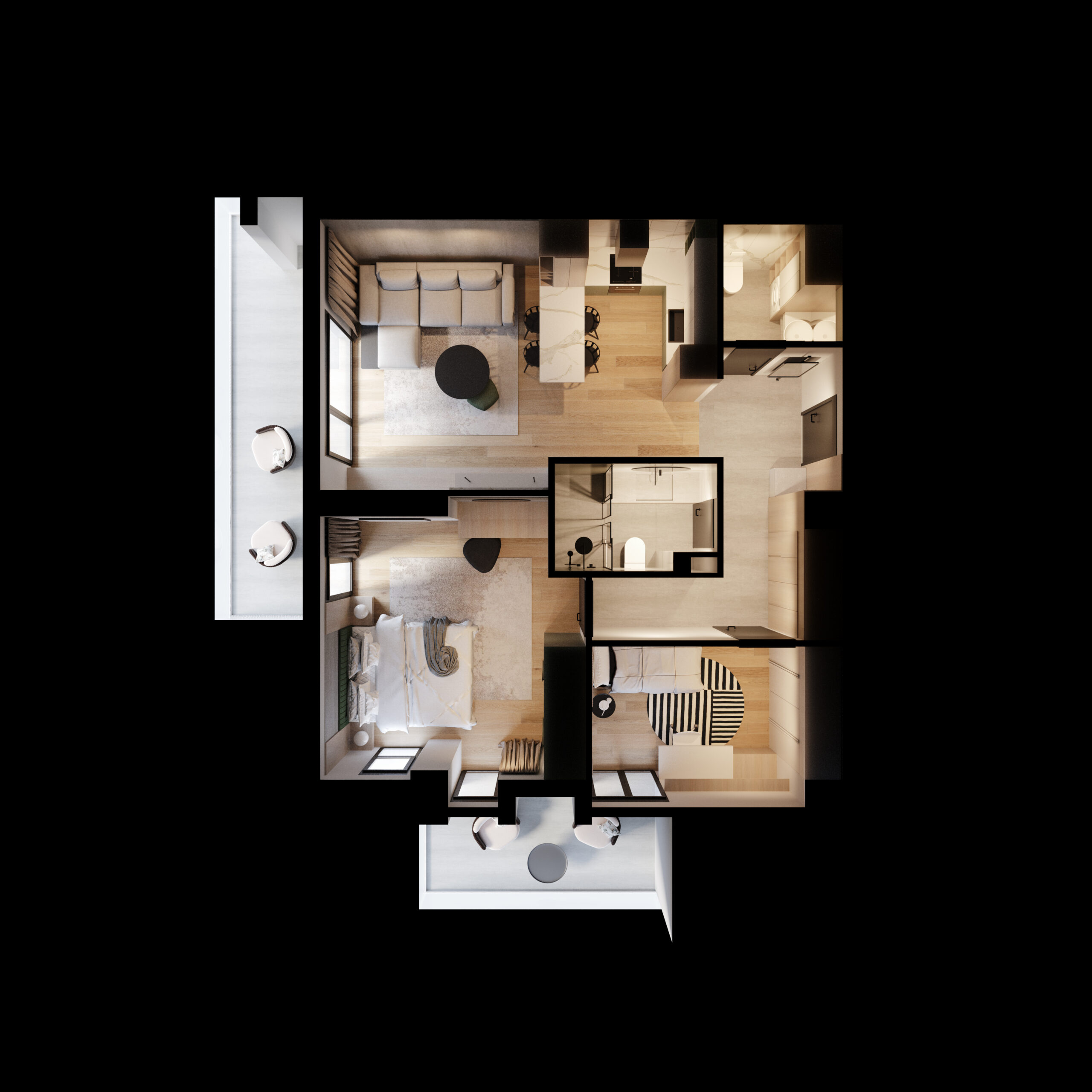 Станот е осмислен за динамичен животен стил со фокус на удобност и приватност. Со топли тонови на дрво, софистицирани завршници и максимално искористен секој метар, овој дом ви овозможува стилско и мирно секојдневие.